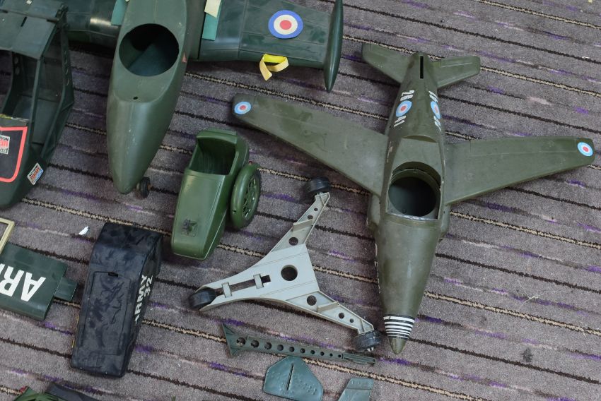 Action Man - a collection vintage Action Man vehicles and accessories for spares / repairs together with x2 flock haired example dolls, one with beard, the other wearing a Canadian Mountie uniform tunic.