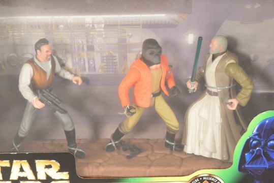 Star Wars - a collection of x7 1990s boxed action figure / playsets. Includes: 1998 Hasbro 'Cantina Aliens' triple action figure set, 1999 Gungan Assault Cannon & Jar Jar Binks set, 1998 Episode I Galoob Micro Machines Action Fleet playset 'Gian Speeder & Theed Palace' playset, 1996 Kenner 'Swoop', Hasbro Power Of The Force 'Jedi Spirits' triple figure set, Power Of The Force 1997 'Cantina Showdown' triple figure set and 1998 Kenner 'Jabba The Hutt's Dancers' triple figure set. All fully factory sealed, unopened. As new.