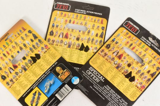 Star Wars – Stephen Merchant’s collection - a collection of x3 original vintage Palitoy / Kenner action figures, with their original card backs. Includes: Bib Fortuna (LFL 1983 Made In Hong Kong COO), Biker Scout (LFL 83 Made In Hong Kong COO), and Chief Chirpa (LFL 1983 HK COO). All with their original Return Of The Jedi card backs. No weapons present.