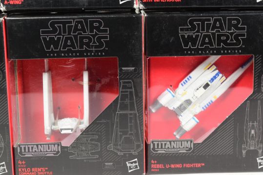 Star Wars - a collection of x10 Hasbro made The Black Series 'Titanium Series' miniature diecast model Star Wars vehicles / ships. Includes: No.33 Death Star, No.19 Jakku Landspeeder, No.20 A-Wing, No.21 Sith Infiltrator, No.03 Kylo Ren Command Shuttle, No.31 Imperial Cargo Shuttle and others. All mint, as new, sealed.