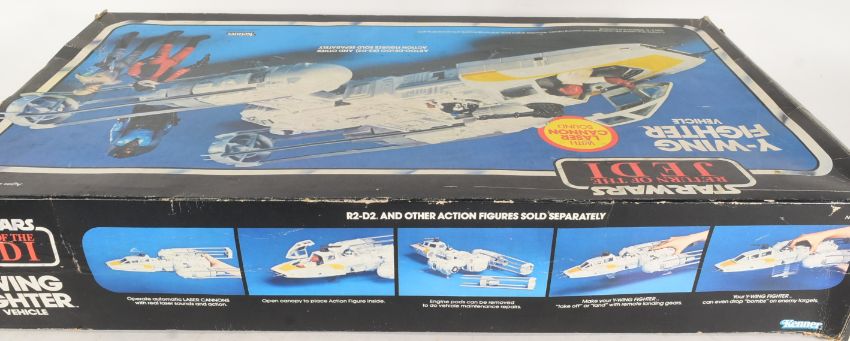 Star Wars - an original vintage 1983 Kenner made action figure playset ' Y-Wing Fighter Vehicle '. 100% complete including the hatch, x2 'bombs', top gun, landing gear, and struts. Housed within its original box which retains the card insert. Original instructions and used sticker sheet also present. Playset used but still G to G+, one plastic strut has snapped (very common). Box G to G+.