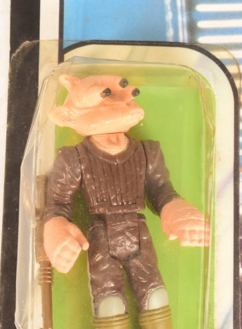 Star Wars - an original vintage 1983 Palitoy made Star Wars carded MOC action figure ' Ree Yees '. Factory sealed upon its original 65 back Return Of The Jedi card. The bubble with no splits but some crushing, weapon taped in place. Card back G to G+ with some sticker wear to the corner. Overall G to G+.