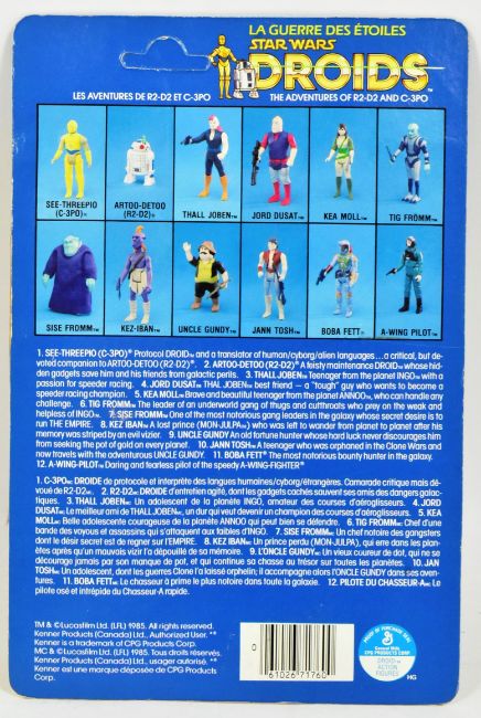 Star Wars - Droids - an original vintage 1985 French-Canadian variant MOC carded action figure ' Thall Joben '. Bubble factory sealed bubble, with no dents or splits. 12 back Kenner (Canada) unpunched card. Card back generally M. Overall VNM+ to M.