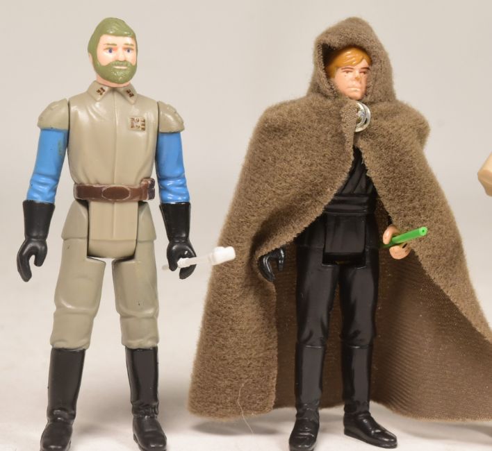 Star Wars - a collection of x3 original vintage Kenner / Palitoy made action figures. Including: 'Princess Leia Organa (Boushh Disguise)' (100% complete with weapon, helmet, and original 65 back Return Of The Jedi card), 'Luke Skywalker (Jedi Knight)' (lacking blaster, but partial original lightsaber present and 65 back ROTJ card), and 'General Madine' (100% complete, plus 65 back ROTJ card). Figures in various conditions from G+ to NM.