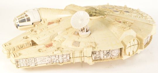 Star Wars – Stephen Merchant’s collection - an original vintage 1980 Palitoy made action figure playset 'Millennium Falcon Spaceship'. 100% complete including the cockpit cover, hatch, hatch struts, chair, table, floor panel, Jedi training ball and arm, large rear panel and all three legs. Housed within its original Palitoy Empire Strikes Back box, with instructions, Palitoy booklet and the fold-out poster. Falcon appears generally VG to VG+ with some discolouration to the exterior.