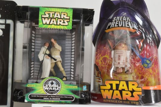 Star Wars - a collection of assorted boxed / carded action figures by Hasbro. Includes: Episode I 1999 Queen Amidala Portrait Edition 12" scale (x2 versions), 2004 Darth Vader silver edition, Silver Anniversary 'Swing To Freedom' set, vintage Power Of The Force by Kenner 'Cantina Aliens' set, a large Rey With Speeder Funko Pop figure and others. All sealed / unused, contents mint.