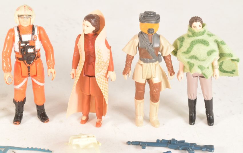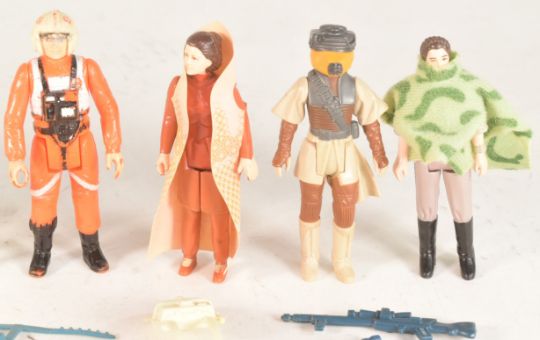 Star Wars – Stephen Merchant’s collection - a collection of x8 original vintage Kenner / Palitoy made Star Wars action figures - all 'main characters' - to include: Luke Skywalker X Wing Pilot, Luke Skywalker Jedi Knight, C3PO With Removable Limbs, Han Solo in Trench Coat, Princess Leia in Combat Poncho, Princess Leia (Hoth Outfit), Princess Leia Organa In Boushh Disguise, and Princess Leia Organa in Bespin Gown. All standard variations. No weapons present, various conditions. Along with a near-complete 'mailaway' exclusive Survival Kit accessory set - featuring: x2 Hoth Backpacks, Jedi Training Backpack, Grappling Hook Belt (no hook), and x5 'assorted laster weapons'.