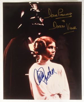 Star Wars - Carrie Fisher (d.2016 Princess Leia) and Dave Prowse (d.2020 Darth Vader) - dual autographed 8x10" colour promotional photograph from the franchise. Signed by Fisher in blue ink to a light area of the image, and by Prowse in gold ink to a dark area of the image. Undedicated. Supplied with a letter of authenticity from Lester Freeman UACC dealer.