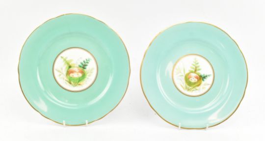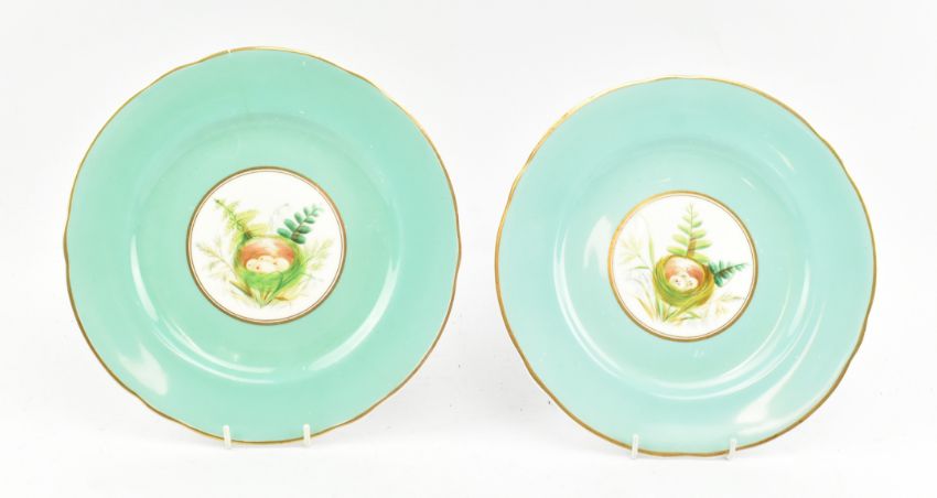 A 19th century porcelain part dinner service The service comprising two tazza dishes on stands and five serving plates, gilt & turquoise borders with floral sprays to centre. Unmarked.