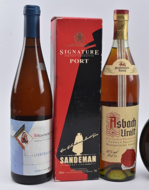 An assortment of seven vintage Continental white, red & rose wine bottles. The lot to include a 1998 Andre Jalbert Bordeaux, Claret, 75cl, 12% vol; a Canard-Duchene Champagne Ludes, 75cl; a 1993 Chateau Lagupeau Graves, 750ml, 12.5% vol; a Asbach Uralt Deutscher Weinbrand German Brandy, 70cl, 38% vol; a bottle of Portuguese Acacio Rose wine, 750ml, 11% vol; a Krausen Keller Produce of Germany Liebfraumilch, 75cl, 8.5% vol; together with a Sandeman Signature port bottle in box, 75cl, 20% vol.