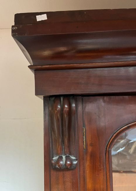 A large 19th century VIctorian mahogany triple-section glazed bookcase cabinet. The bookcase having a flared pediment atop over three glazed front cabinets. Each revealing a shelved interior, each flanked by scrolled embellishments atop. All raised on a squared base with three cupboard doors. All raised on plinth base.