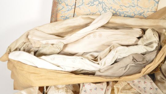 A 17th century walnut oyster veneered chest. The chest having a slope front with oyster veneer and stylised motifs. The lid opening to reveal a spacious interior. Comprising of many pieces of fine lace, with additional ladies' gloves, a woven hat and doilies. Also featuring a handwritten letter with notes on the History of Lace by Mrs Bury Palliser, London: Eyre and Spottiswoode 1872, and a silk mercer's card by Mawe & Son.
