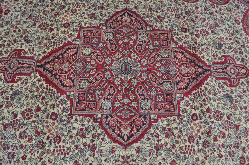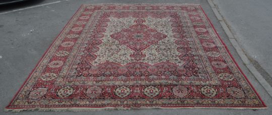 A large early 20th century Axminster manner wool carpet rug. The carpet having a central medallion in red & white colourway intricately woven with stylised motifs. Central white ground panel with further foliate & floral decorations. All enclosed within graduating outer borders with tassels to ends.