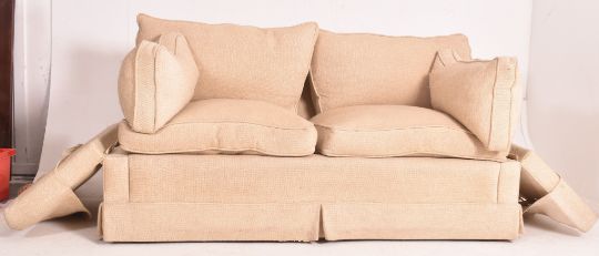 A contemporary Knole / Knoll drop arm upholstered three-seater sofa / settee. The sofa having a straight back with oak finials to each side with rope tassels. Drop arms to each end with cushioned seat and backrest. All upholstered in a cream fabric.