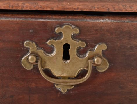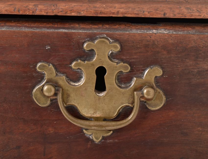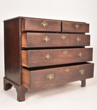 A George III 19th century mahogany chest of drawers. The chest having a flared chamfered top over a two-over-three bank of drawers. Each with brass batwing escutcheons and swing handles. All raised on bracket feet.