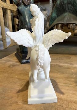 A contemporary 21st-century carved polished solid white marble mythological inspired sculpture of Pegasus and female rider. The female figure wearing a crown with flowing drapery. Pegasus depicted in a rearing position with splayed wings. All raised on a stepped plinth base.This lot is ONLY available for viewing by appointment, address to follow upon request. Collection from an alternative address, disclosed upon purchase. Measures approx. 65cm x 55cm x 20cm.