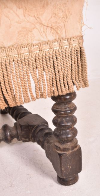A Jacobean 17th century reupholstered and oak framed high back reading chair. The chair having a high slim back rest over C scrolled elbow rests and cushioned seat. All re-upholstered in cream & gold fabric. All raised on bobbin turned & block supports united by H shaped stretcher.