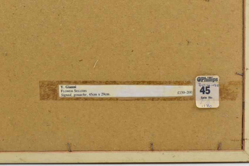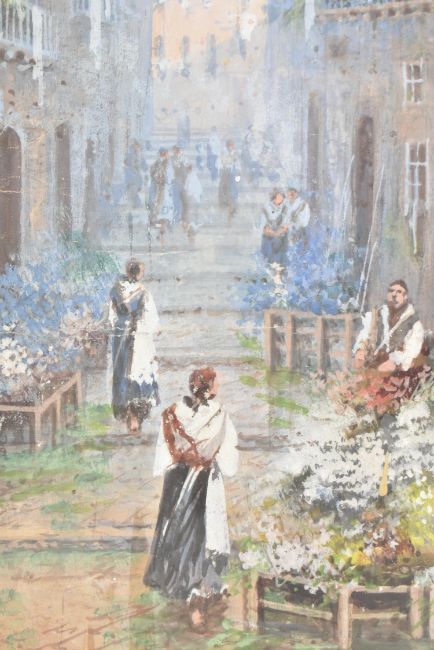 Maria Gianni (Italian, 1873 - 1956) - a 20th century watercolour on paper genre painting. The watercolour depicting a street view with flower market stalls. Signed M. Gianni to lower right. Mounted, framed & glazed.