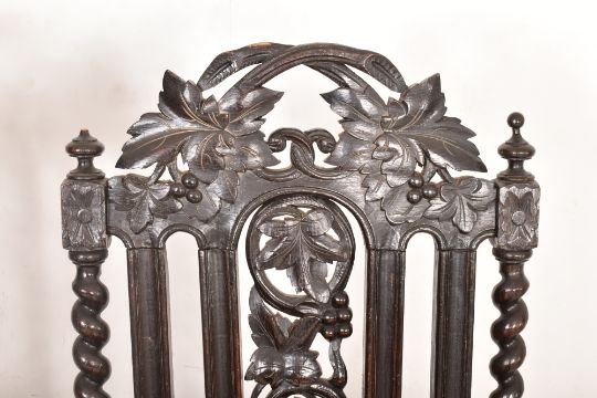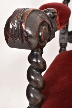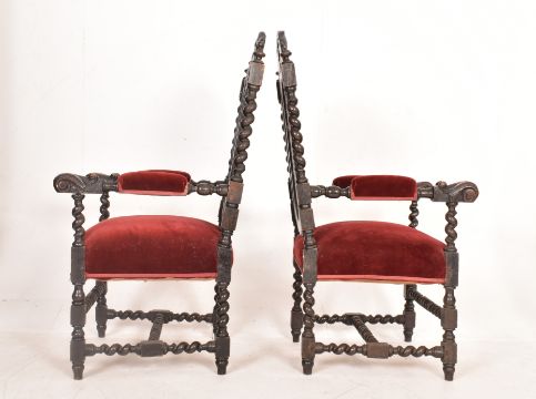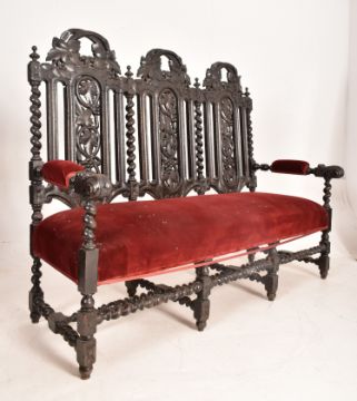 A late 19th century Victorian carved oak three-piece suite in the Jacobean taste. The suite comprises a two-seater settee and matching pair of armchairs. Each having elaborate carved back rests with grapes and leaf worked detailing flanked by barley twist supports. Red valour padded seat rests flanked by carved scrolled armrests. All raised on block and turned legs united by stretchers. Damaged repair to armrests.