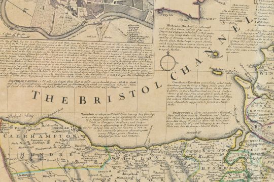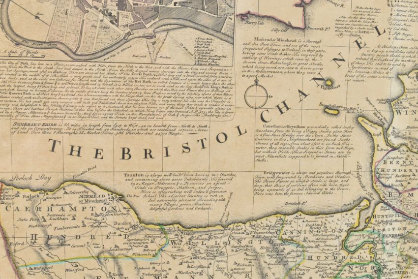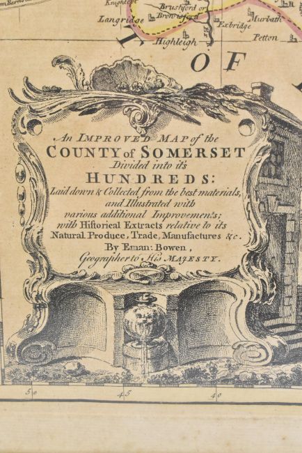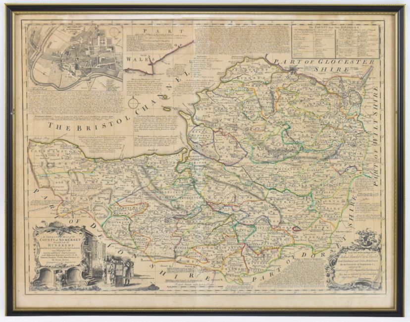 Somerset local interest. An Improved Map of the Country of Somerset divided into its Hundreds, laid down & collected from the Best Materials and illustrated with various addittional Improvements with Historical Extracts relative to its Natural Produce, Trade, Manufacture etc. by Eman. Bowen. Printed for Carington Bowles in St. Paul's Churchyard. Hand coloured borders, vignette plan of the city of Bath upper left hand corner, cartouche dedication to John Pawlet Earl Pawlet lower right hand corner. Taken from 1749 The Large English Atlas by Emmanuel Bowen and Thomas Kitchin, cental fold visible. Some age-toning, as to be expected. Framed & glazed in Hogarth frame.