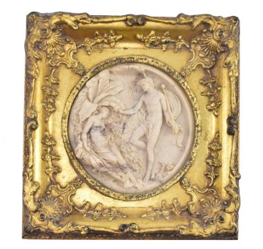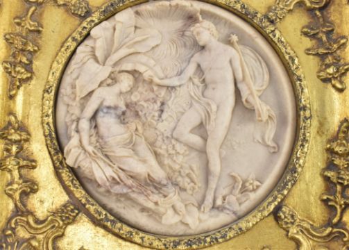 Edward William Wyon - a19th century Victorian carved marble plaque held within a gilt ornate frame. Circular composite relief panel depicting Oberon and Titania from William Shakespeare's A Midsummer Night's Dream.
