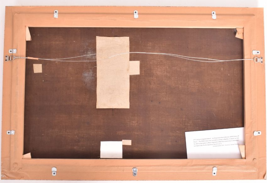 A 19th century English school maritime oil on canvas painting. The painting depicting an 18 gun merchant schooner ship, HMS Janes, off Dover. Set within a gilt frame with notations plaque to the verso. Unsigned. Repairs to verso of canvas.