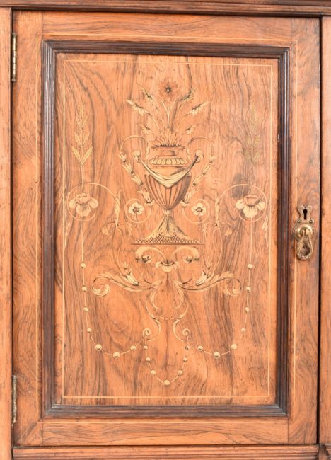 An early 20th century walnut veneered and inlaid sideboard dresser cabinet. The cabinet with swan pediment atop glazed cupboard units. Mirrored back board over sideboard featuring central drawer over two shelves, flanked by cabinets to either side. This over single long shelf on eight tapering squared supports.