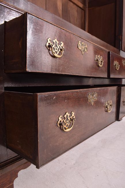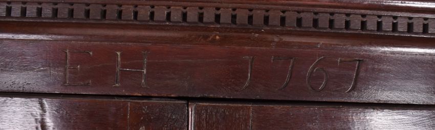 An early 18th century George III oak linen press / livery cupboard. The cupboard featuring flared pediment atop over twin single panelled drawers. Carved beneath pediment initials E H & dated 1767. Flared base with four drawers, each with twin brass handles & escutcheons.