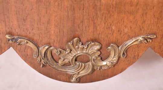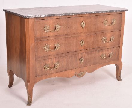 A French 19th century marble top & walnut chest of drawers commode. The chest having a black marble top with canted corners. Bank of three drawers below, each with acanthus leaves shaped brass handles and escutcheon. Shaped apron below, all raised on cabriole supports with brass embellishments.