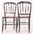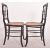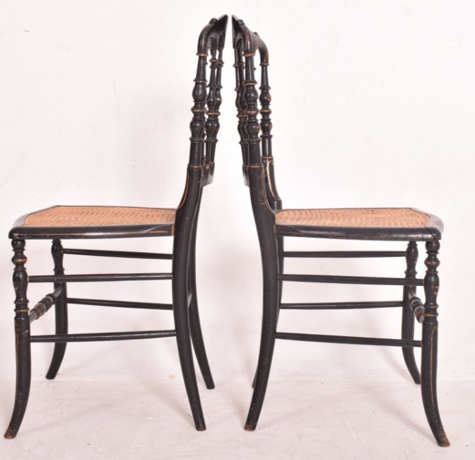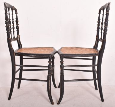 In the manner of Jennens and Bettridge - a set of three Victorian 19th century ebonised wood and cane parlour chairs. Each chair having a shaped rail back rest with turned spindles all decorated with floral gilt motifs. Cane woven seat all raised on turned & splayed supports united by peripheral stretchers.