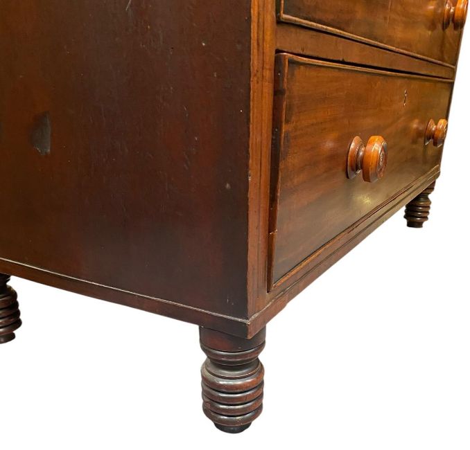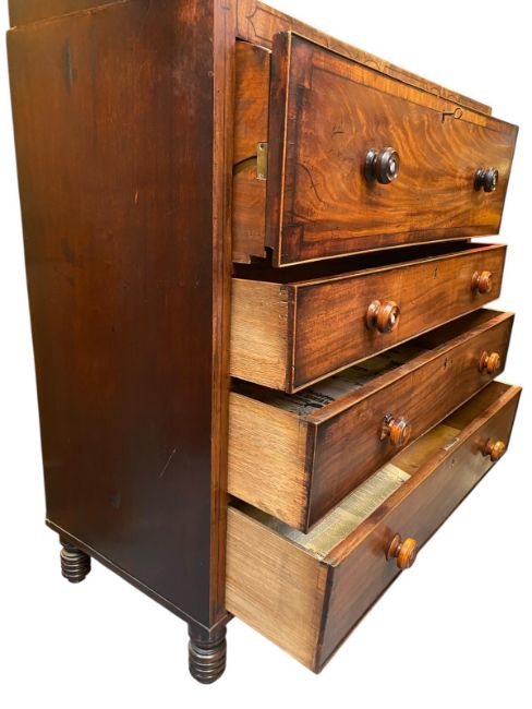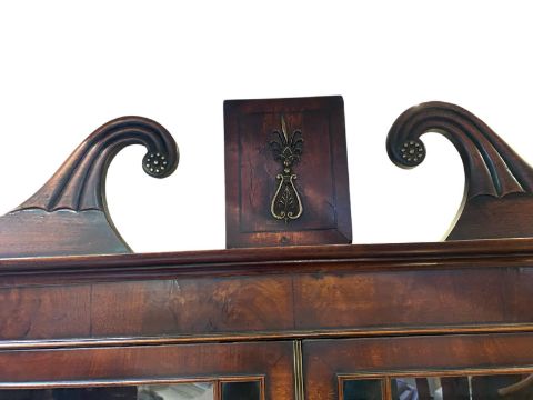 A George III 19th century mahogany secretaire bookcase. The cabinet having a pierced inlair pediment top over an astragal glazed bookshelf. The base having the fall front top drawer opening to reveal a fully appointed interior. Bank of three twin handled drawers below. All raised on bobbin turned supports.