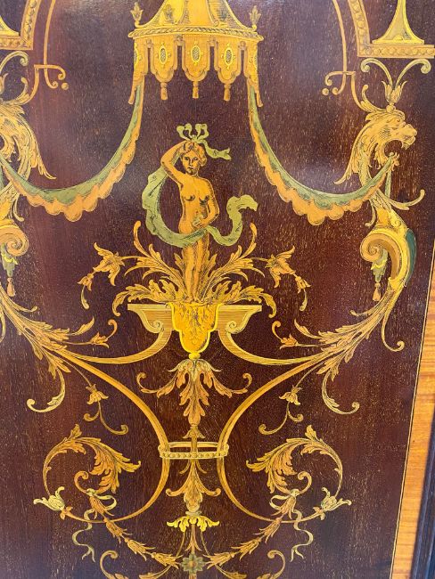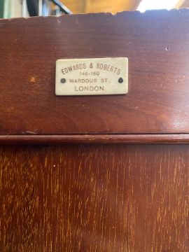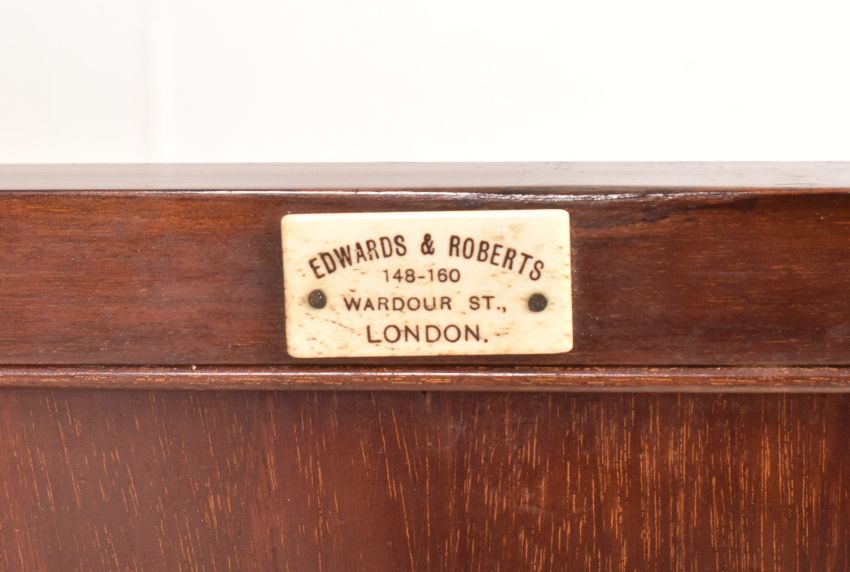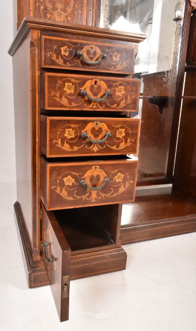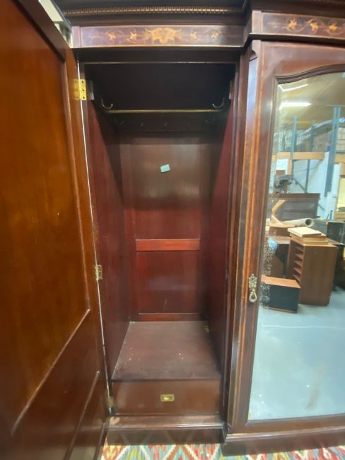 Edwards & Roberts - an Edwardian mahogany and satinwood three-piece bedroom suite profusely inlaid with neo-Classical decoration and satinwood crossbanding. The suite comprising a large triple compactum wardrobe having shaped pediment over a central mirror door flanked by two further doors, all concealing hanging space and drawers; a thick marble-topped washstand having a raised gallery back with further marble panels and central mirror over a recessed base with drawers and cupboards; and a drop centre dressing table having a full-length mirror (with original mirror plate having foxing) flanked by raised pedestals with cupboard fitted with drawers over further drawers and cupboards below. Maker's marks throughout the suite with label and stamp marks.