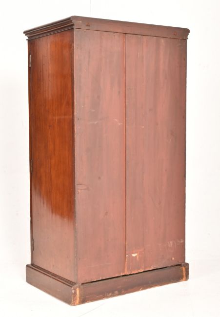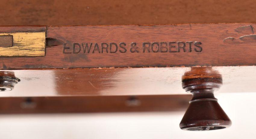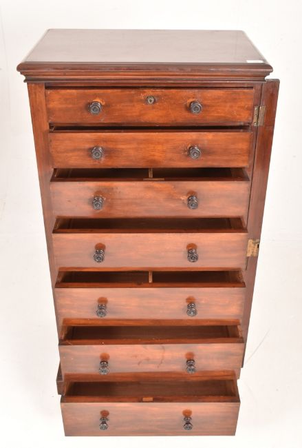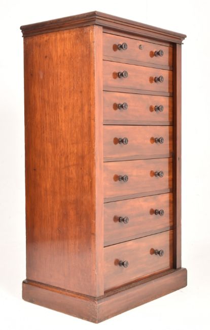 Edwards & Roberts - A High Victorian tall mahogany Wellington chest of seven drawers. The chest having a flared pediment atop over seven twin handled drawers. Each with turned handles. Singled articulated flap to side. All raised on plinth base. Top drawer stamped to to inside.