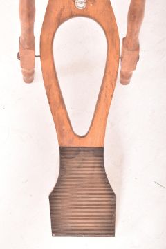Tom Hill, London - a late Victorian / early 20th century oak free-standing farmhouse boot jack. Of turned constuction with the jack having a block and turned structure. Label to front.