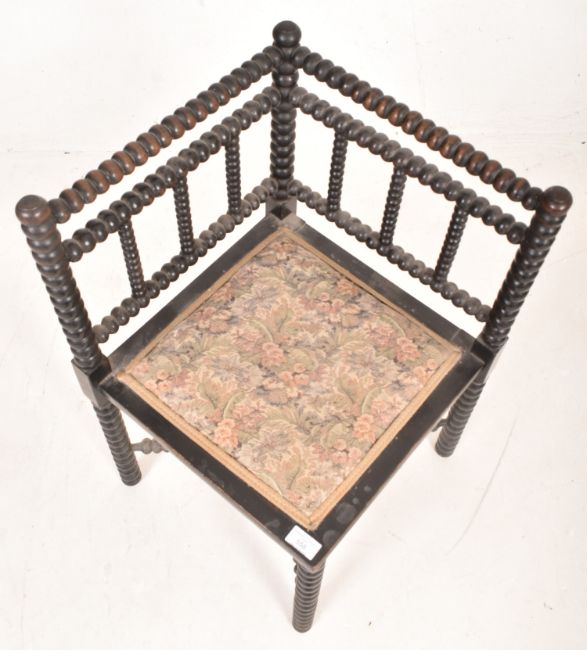 A 19th century Art & Crafts oak bobbin turned corner chair. The chair having a bobbin turned backrest with floral upholstered seat rest raised on bobbin legs united by an X-framed stretcher.