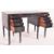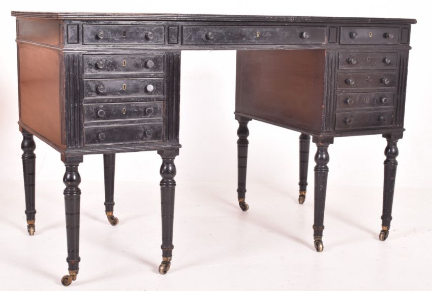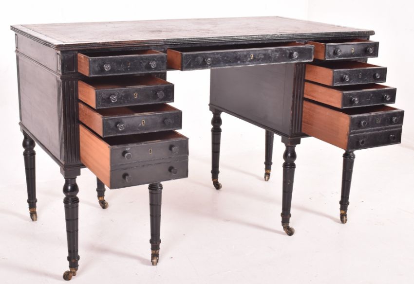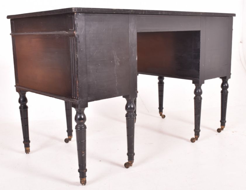 Morison & Co, Edinburgh - An Aesthetic Movement late 19th ebonised wood kneehole writing table desk. The desk having dark green & gilt tooled central skiver over a central twin handled drawer. The central drawer flanked by banks of five drawers with reeded detailing. All raised on turned tapering supports with brass castors to ends. Stamped to inside of drawers.