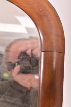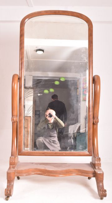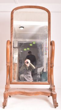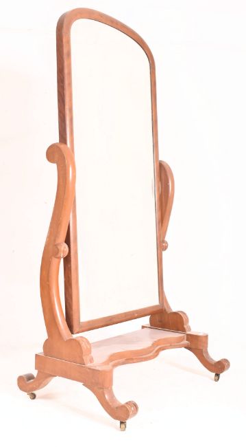 A Victorian late 19th century mahogany cheval mirror. The mirror having a curved frame with central bevelled edge mirror plate. All hung on scrolled side supports over a stepped base raised on scroll terminal feet and castors