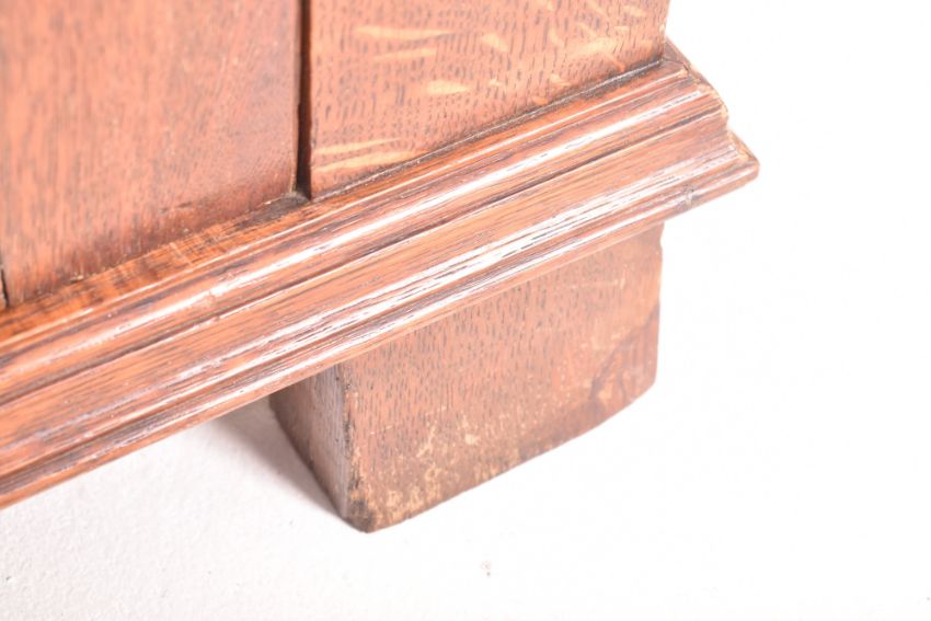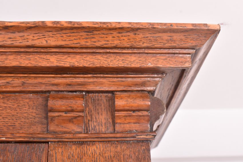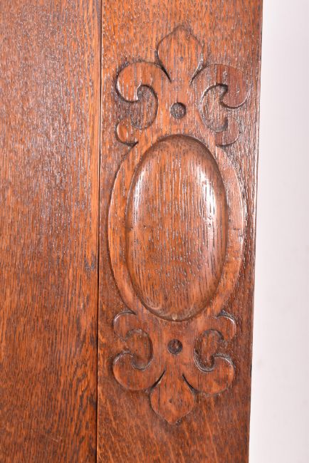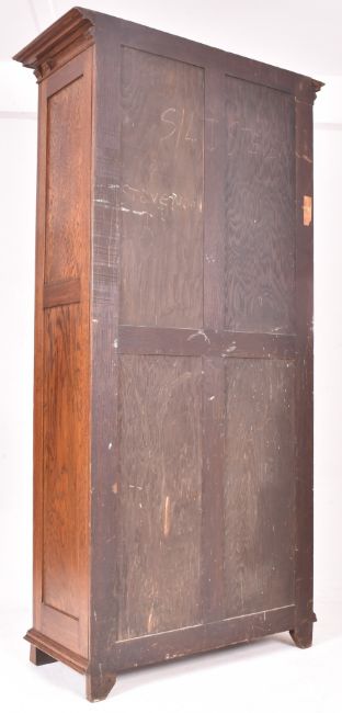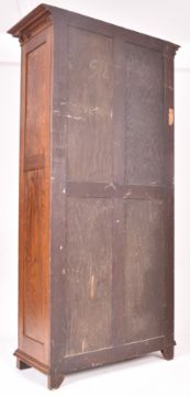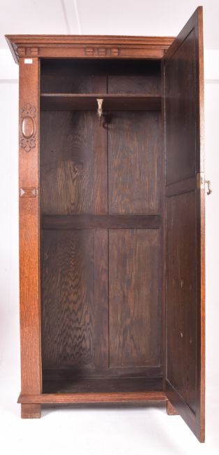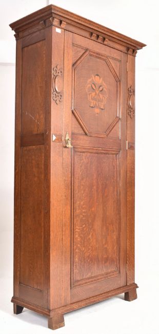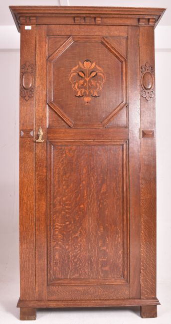Attributed to Shapland & Petter - An Arts & Crafts late 19th oak wood inlaid single door wardrobe cupboard. The wardrobe having a flared pediment top over a two-panel single door decorated with foliate inlays. The door flanked by relief embellishments. All raised on block feet.