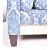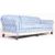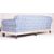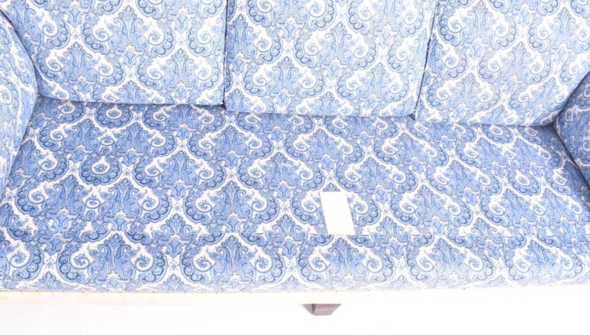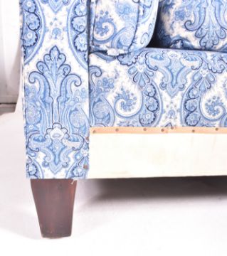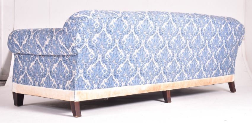 A late 19th / early 20th century re-upholstered mahogany framed three seater sofa. The sofa upholstered in bright blue & white Damask style fabric with padded backrest and scrolled elbow rests. Cushioned seat, all raised on squared tapering wooden supports.
