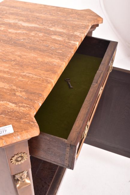 A French Napoleon III 19th century mahogany & marble top pier cabinet cupboard. The cupboard having a shaped marble top over a twin handled drawer with single doop cupboard space below. The drawer and door single panelled with brass lining. The front flanked by shaped columns with female heads & feet. All raised on tapering supports.