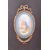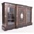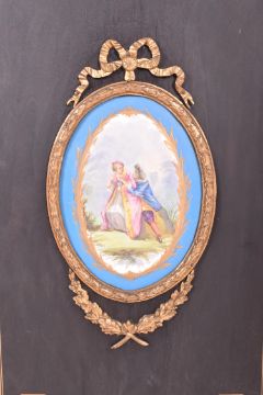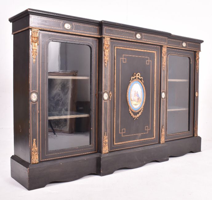 A 19th century High Victoria ebonised wood with hand painted porcelain inset plaques breakfront sideboard credenza. The credenza having a straight top with chamfered edges over a central cupboard door with ormolu & painted gilt details with central oval porcelain plaque depicting a courting couple. The central door flanked by glazed front shelved cabinets. The sideboard decorated with further circular ceramic plaques painted with floral motifs. All raised on plinth base.