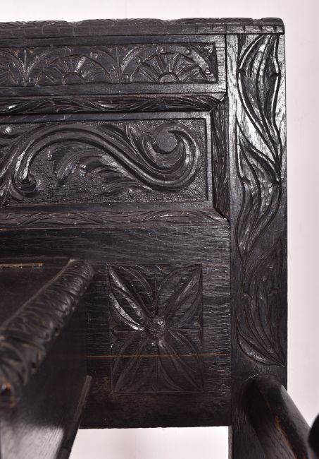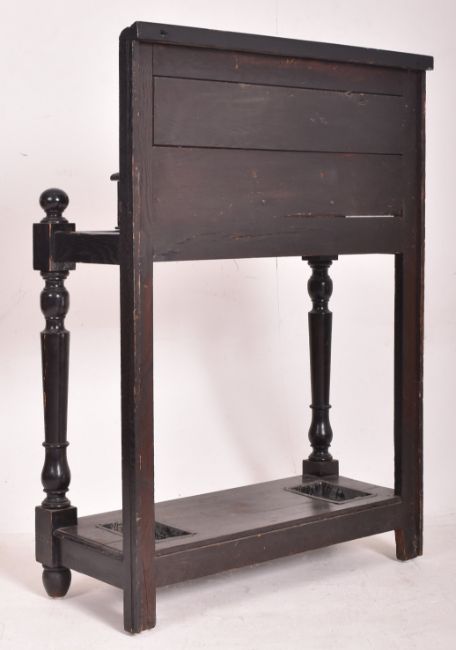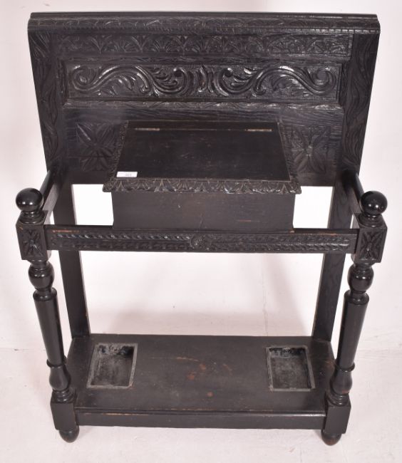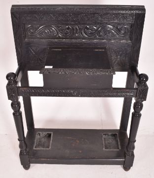 A Victorian 19th century Jacobean Revival ebonised hall umbrella stand. The umbrella stand featuring panelled back with scrolled foliate carved frieze. Central lidded compartment with gadrooned edges. Turned column supports, raised on circular tapered feet. Complete with original twin umbrella drip trays.