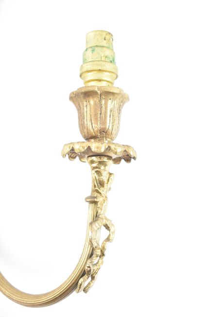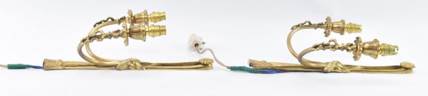 A pair of French Empire inspired late 19th century gilt metal twin arm wall sconces lights. Each having a flower roundel atop over a a draped rope shaped body with twin scrolled arms decorated with ribbons and floral motifs.