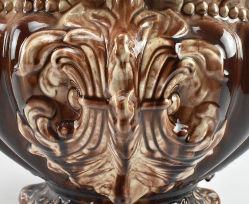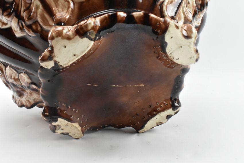 A large early 20th century majolica glazed floral floor planter jardiniere. The planter having a shaped rim with florally shaped corners with swags surrounding a gadrooned body. All raised on a shaped foot.