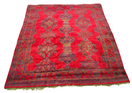 A large early 20th century Ushak Turkish wool-pile floor carpet rug. The rug of large square form having a red ground with central medallions with a geometric patterned border. All in red, greens and blue.