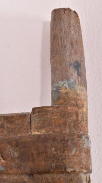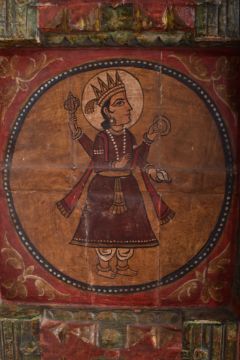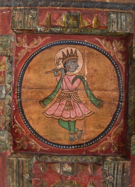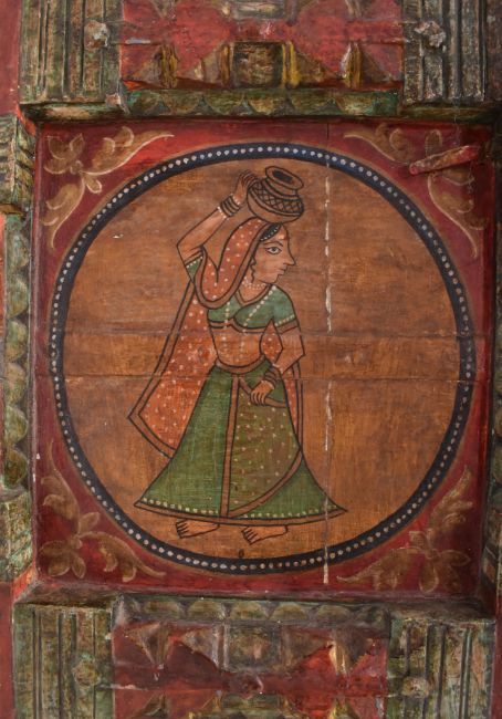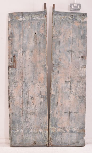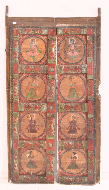 A pair of Indian, possibly Bikaner Rajasthan, 19th century re-painted wooden doors. Each having carved relief panels with various depictions and decorated frames.