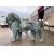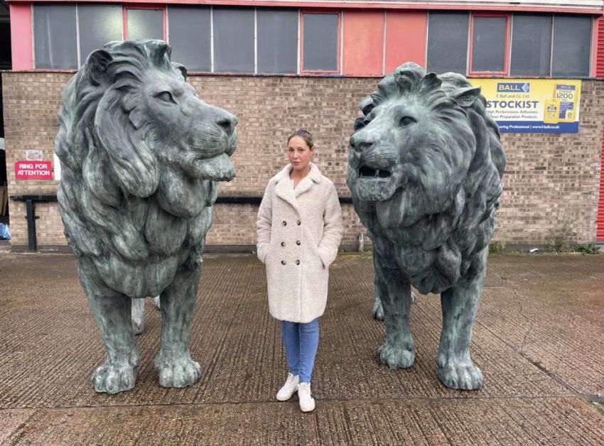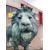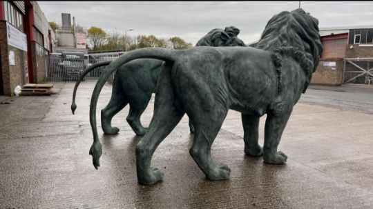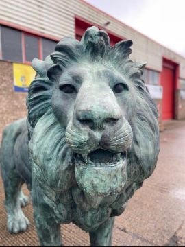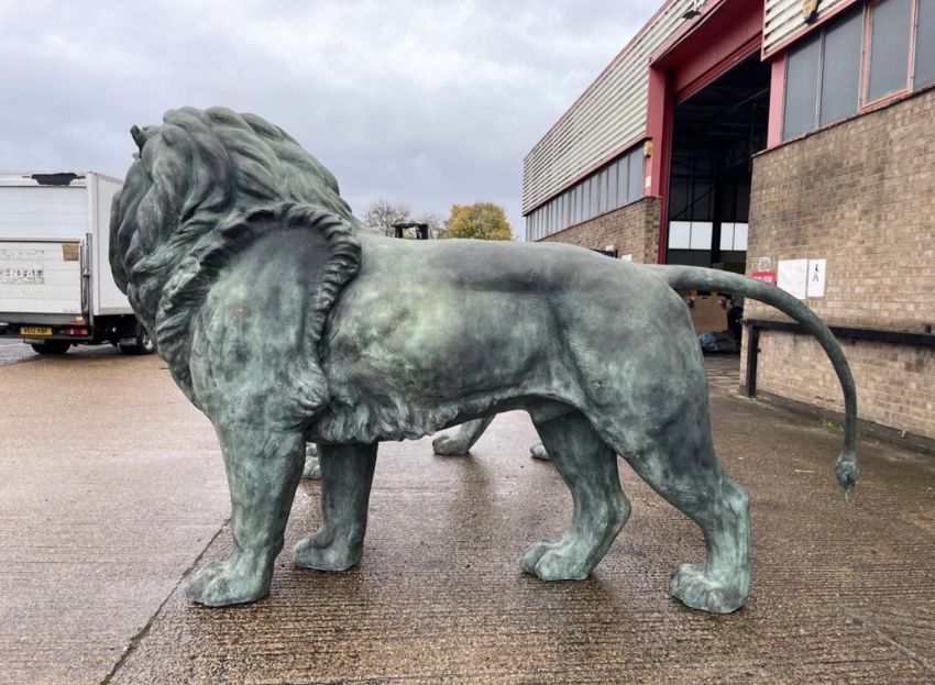 A pair of oversized late 20th / early 21st century hollow bronze outdoor / entrance sculptures of lions. Each statue built to face each other when placed. One with mouth slightly open.This lot is ONLY available for viewing by appointment, address to follow upon request. Collection from an alternative address, disclosed upon purchase. Largest lion measures approx. 370cm x 220cm x 90cm.