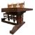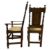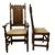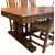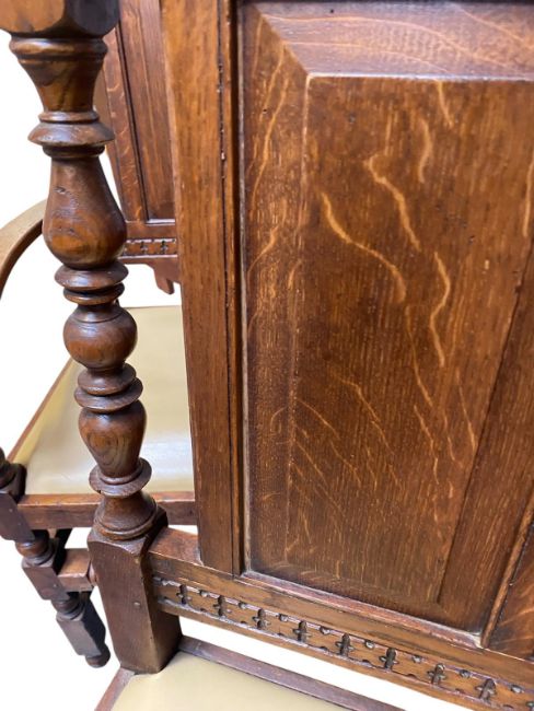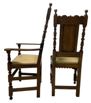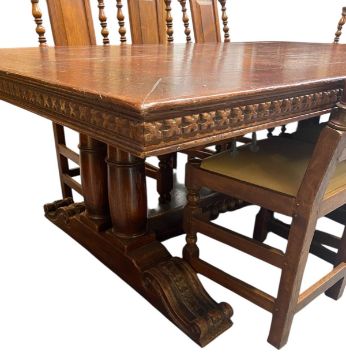 A large 17th century Revival carved oak refectory farmhouse table with eleven chairs. The table having a rectangular top with geometric carvings to sides. All raised on pedestal supports with turned columns and carved scrolled feet, all united by central stretcher. Each chair having a high back rest with scrolled carvings and turned side supports. Leatherette padded seats all raised on turned and block supports united by peripheral stretchers. Multiple chairs with damage, mainly to the back rests.