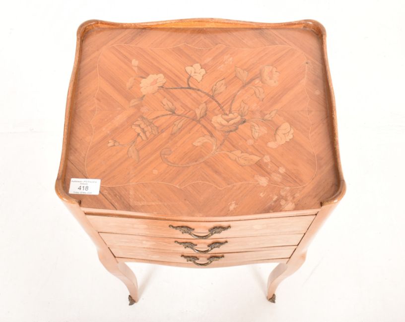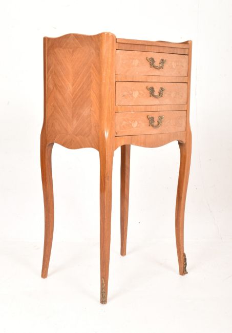 A French Continental 19th century walnut & satinwood marquetry bedside chest. The bedside table having a short gallery surround over a bank of three drawers. All inlaid with floral swags and single brass handles. All raised on cabriole supports.
