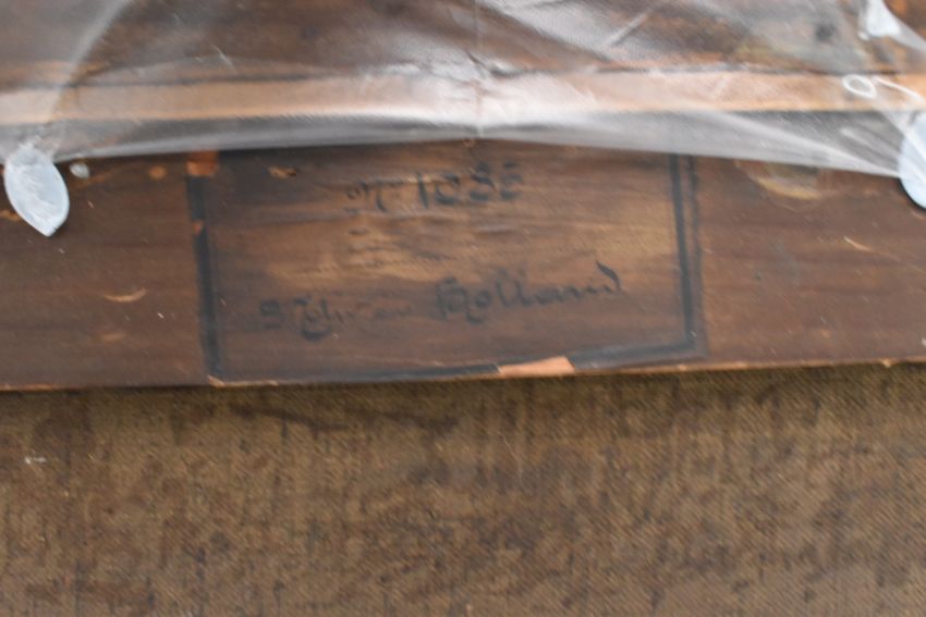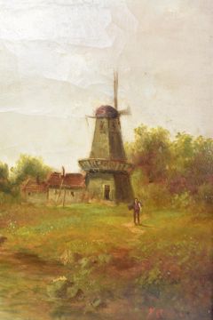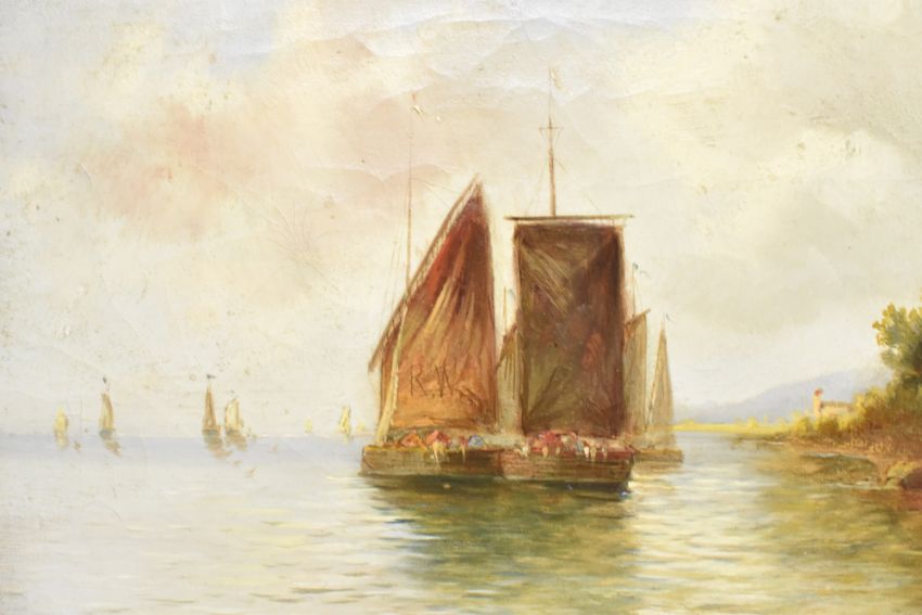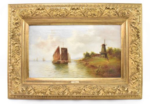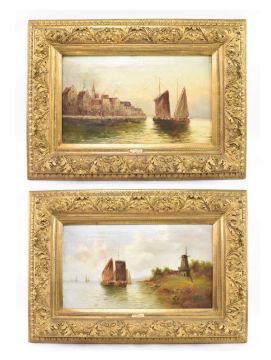 V. Orban (Dutch school, 19th century) - a pair of 19th century oil on canvas landscape Flemish paintings in 19th century giltwood & gesso cassetta frames. The lot comprising a harbour scene with boat, signed in red lower left. Together with a river bank scene with boat and lighthouse, signed lower right in red. Each framed in giltwood and gesso frames with intricately carved oak leaves.